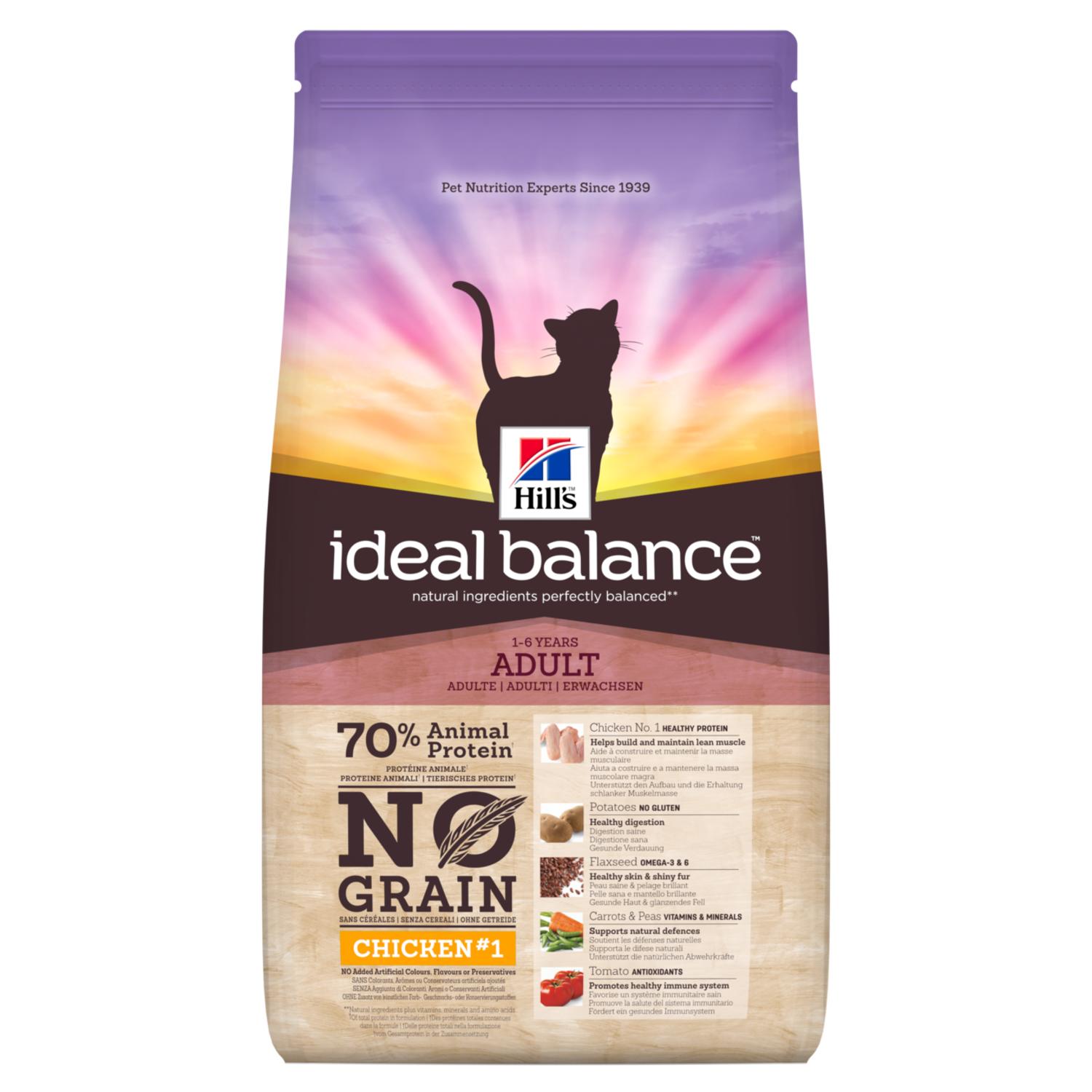 Ideal Balance™ No Grain Feline Adult está especialmente formulado para cubrir las necesidades de los gatos adultos y está elaborado SIN CEREALES. Garantizamos una nutrición perfectamente equilibrada para tu perro, ni más ni menos.