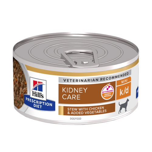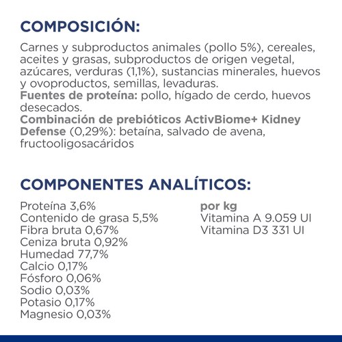 Hill's Prescription Diet k/d con pollo y verduras añadidas es un alimento dietético completo para ayudar a la función renal en caso de insuficiencia renal crónica o pasajera en perros adultos. Este alimento tiene bajo contenido de fósforo, contenido limitado de proteínas de alta calidad.